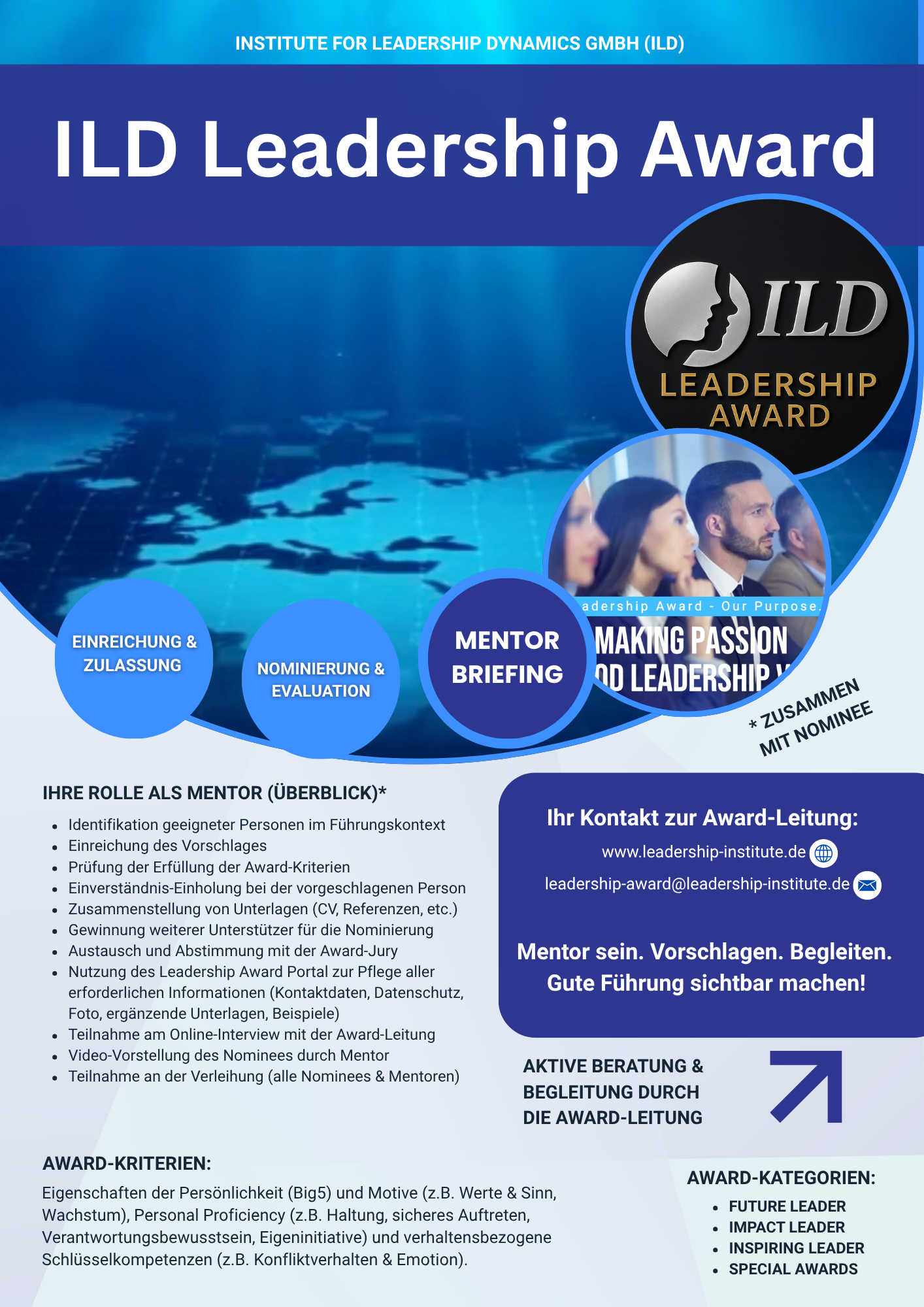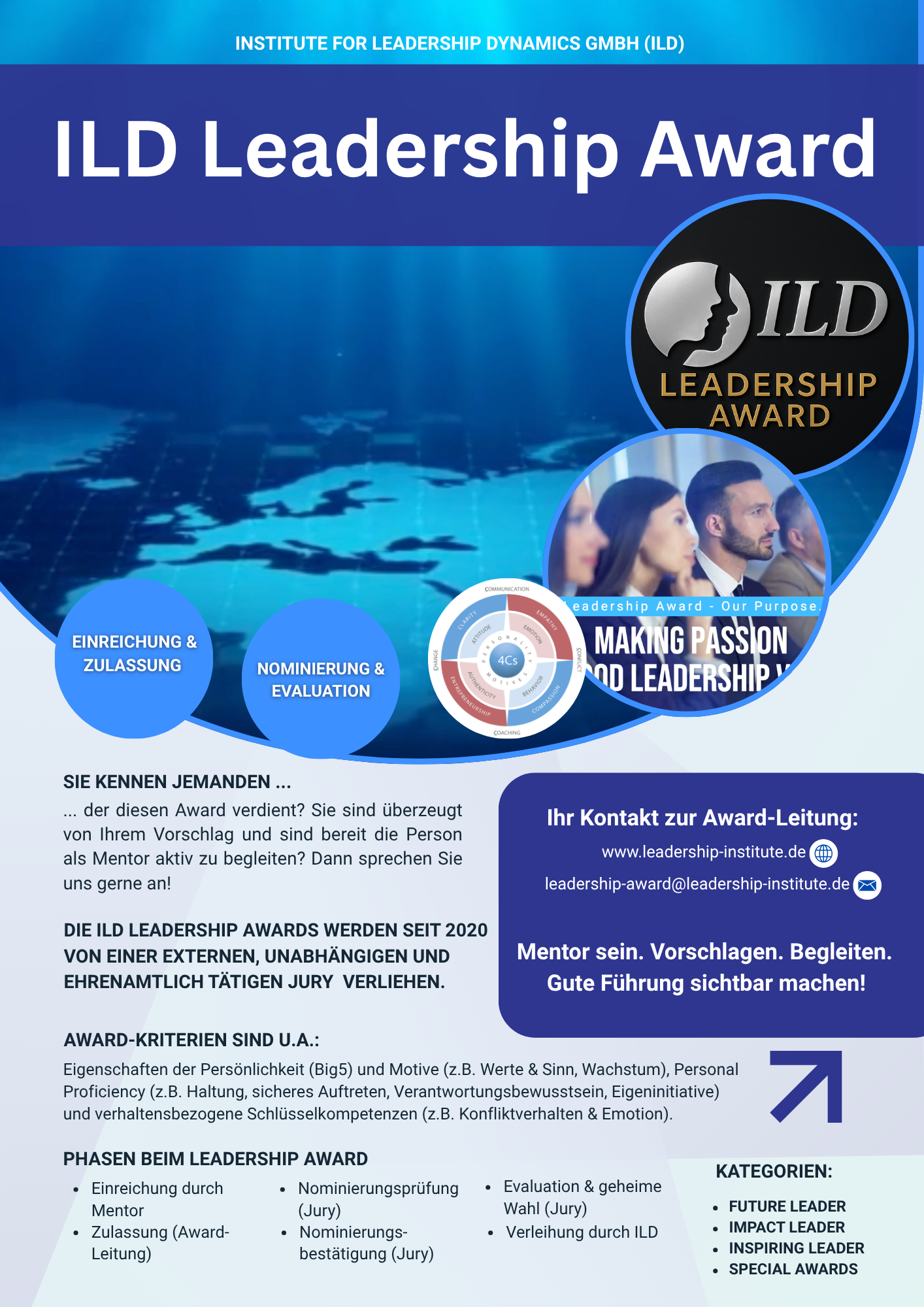 Unser Führungsphilosophie bezieht sich auf die Person, ihre Haltung, ihre Motive, die Emotion und verhaltensbezogene Schlüsselkompetenzen in der Zusammenarbeit und Führung wie beispielsweise andere zu beeinflussen, zu befähigen, zu inspirieren, um gemeinsame Ziele zu erreichen, Veränderungen proaktiv als Team zu gestalten und individuelle als auch teambezogene Potenziale bestmöglich zu entwickeln. Mit dem ILD Leadership Award zeichnen wir herausragende Führungskräfte aus, die diese Eigenschaften vereinen.