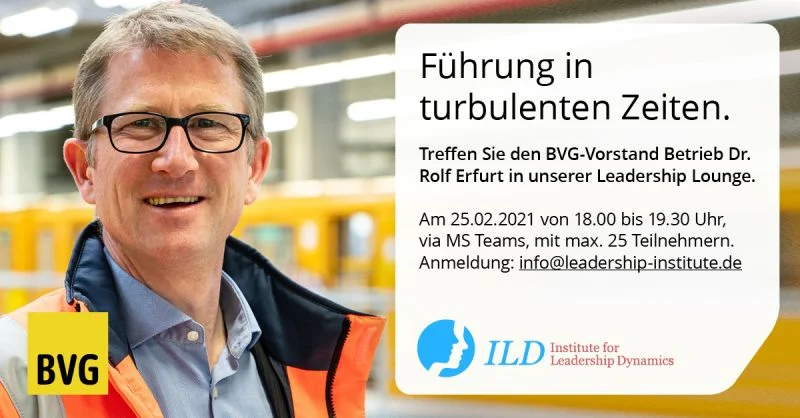 Unter diesem Motto sprach Dr. Rolf Erfurt in der diesmal virtuellen Leadership Lounge des Institute for Leadership Dynamics (ILD). Unsere Gäste aus dem Top Management waren beeindruckt von den Herausforderungen und den Lösungsansätzen, die erforderlich sind, um einen systemrelevanten Mobilitätsanbieter wie die Berliner Verkehrsbetriebe gut durch die Corona-Krise zu führen.