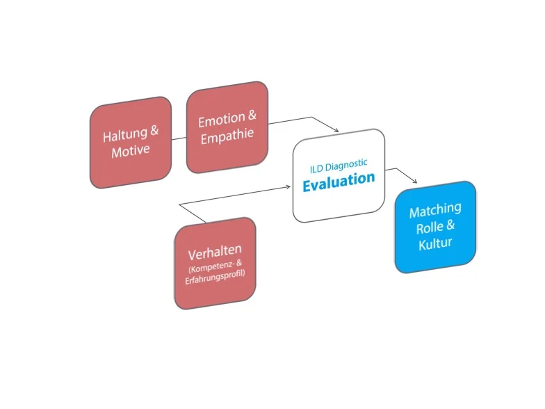 Für erfolgreiche Personalentscheidungen ist die Analyse der persönlichen, rollenbezogenen und kulturellen Eignung ebenso wichtig wie das Matching mit dem zukünftigen Team. Evaluation mit ILD schafft die effektive Basis für eine systemische und wertschätzende Bewerberauswahl bzw. Qualität der Besetzung von Schlüsselpositionen. Die Zusammenführung interdisziplinärer Kompetenzen und wissenschaftlicher und bewährter Tools ermöglicht einen fundierten Entscheidungsprozess: Wir schauen dabei auf die Haltung, Motive, Emotionen und diagnostizieren verhaltensbezogene Schlüsselkompetenzen der Zusammenarbeit und Führung.